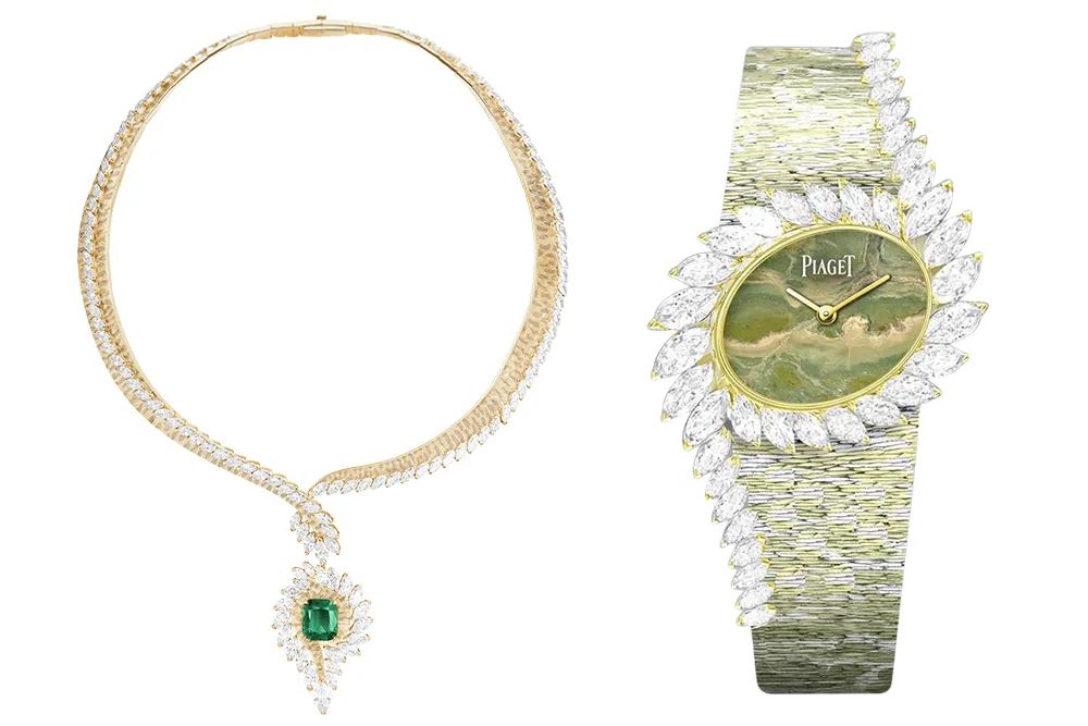 此外,伯爵也带来一枚Foliatura绿意光华高级珠宝腕表,这枚造型优雅的手镯式腕表以金雕工艺表达了伯爵对生机盎然的绿色世界的颂赞,白金打造的表身以高超的金雕工艺镂雕,上方镶嵌绿玉髓与钻石,勾勒出造型多变的叶片线条,部分叶片则以宫廷图腾装饰,翠色与其相互辉映,雪花镶嵌工艺打造的钻石表盘则巧妙地融入在一片华美璀璨之中。