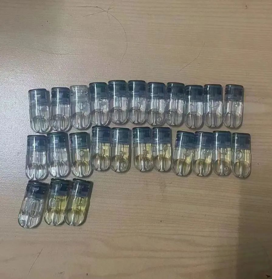 资料图:2月23日和3月9日,海南省公安厅港航公安局民警在犯罪嫌疑人杨某、谭某身上查获202个烟弹。经检验,该批烟弹烟油含有依托咪酯成分。供图 / 海南省禁毒办