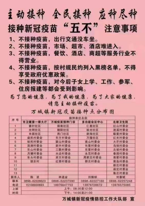 海南万宁万城镇人民政府3月31日发布声明:在宣传发动广大人民群众接种新冠疫苗时,制定“五不”注意事项,过于简单粗暴,引发热议。现对该“五不”注意事项予以撤销,并就这种简单粗暴的宣传方式向广大人民群众表示诚挚的歉意。